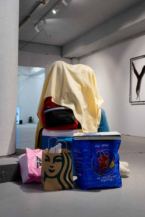 A sculpture that invites reflection on themes of invisibility and social consciousness, based on an observation during a walk through the streets of New York during the artist residency 2023. A detail was added to the sculpture sponsored by the Viennese sculptor Götz Bury - a piece of bread baked from shredded 10€ pieces from one of his “cooking show” performances.